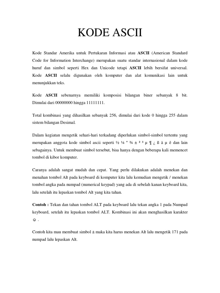 Perlu di ketahui bahwa setiap simbol yang ada pada keyboard mewakili tiap kode ascii misal. Tabel kode ascii 8 bit tabel kode ascii 8 bit ascii american standard code for information interchange atau kode standar america untuk pertukaran informasi merupakan suatu standar internasional dalam kode huruf dan simbol seperti hex dan unicode tetapi ascii lebih bersifat universal. Selain itu ada juga beberapa kode spesial didalam penambahan set karakter alfanumerik.