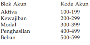 Kode akun pengertian kode akun kode akun dicantumkan untuk memudahkan proses pencatatan pencarian penyimpanan serta pembebanan pada setiap akun. Kode angka blok adalah pembuatan kode akun dengan mengelompokkan akun menjadi beberapa kelompok dan setiap kelompok diberi satu blok angka yang berurutan sebagai kodenya. Misalnya harta diberikan nomo2 100 199 kewajiban diberi nomor 200 299 modal diberikan nomor 300 399 pendapatan nomor 400 499 dan beban nomor 500 599.